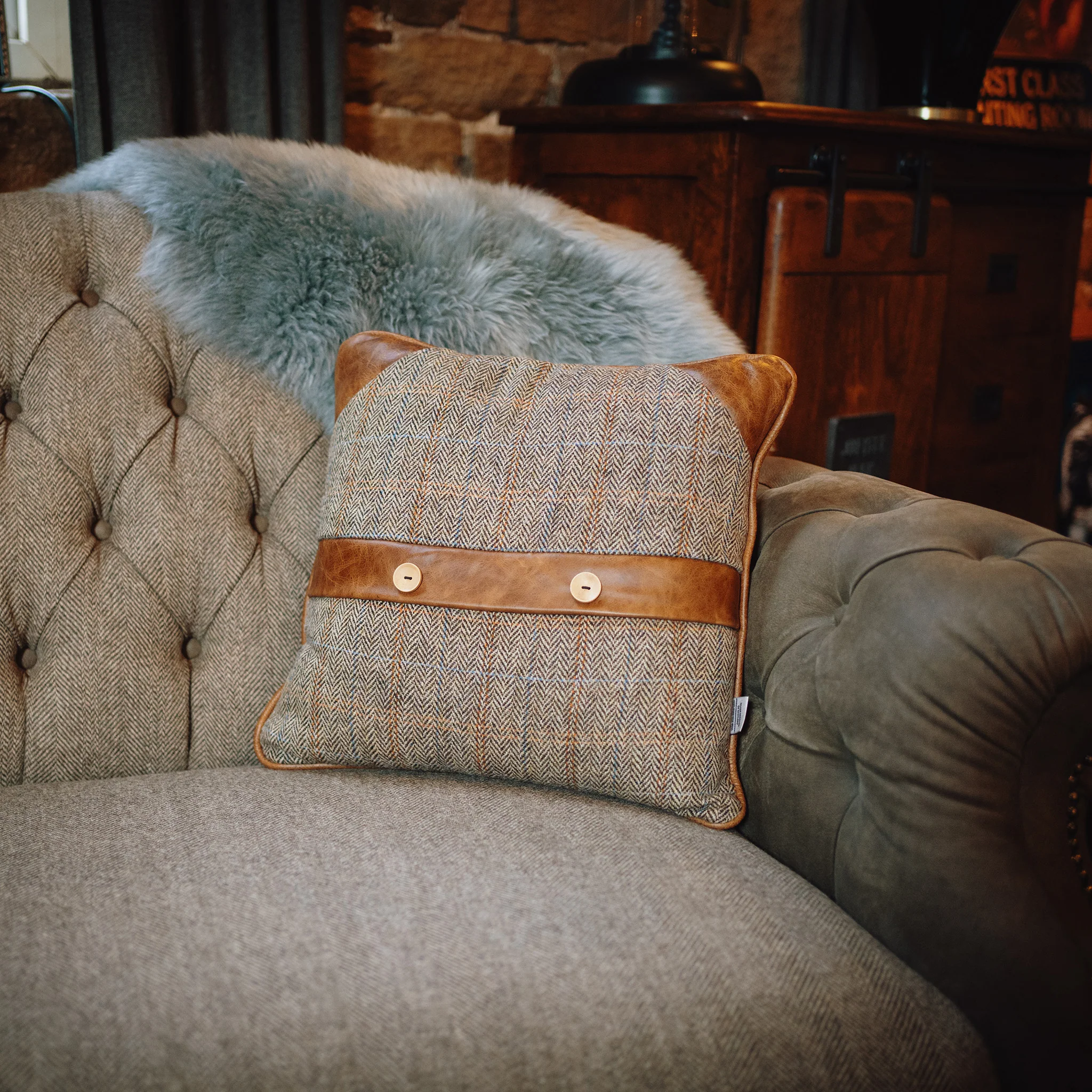 Add a touch of heritage charm and refined comfort to your living space with our Harris Tweed Thorn cushion. Expertly handcrafted, this 40 x 40 cm cushion combines the enduring elegance of authentic Harris Tweed wool with luxurious leather detailing for a distinctive and timeless look.