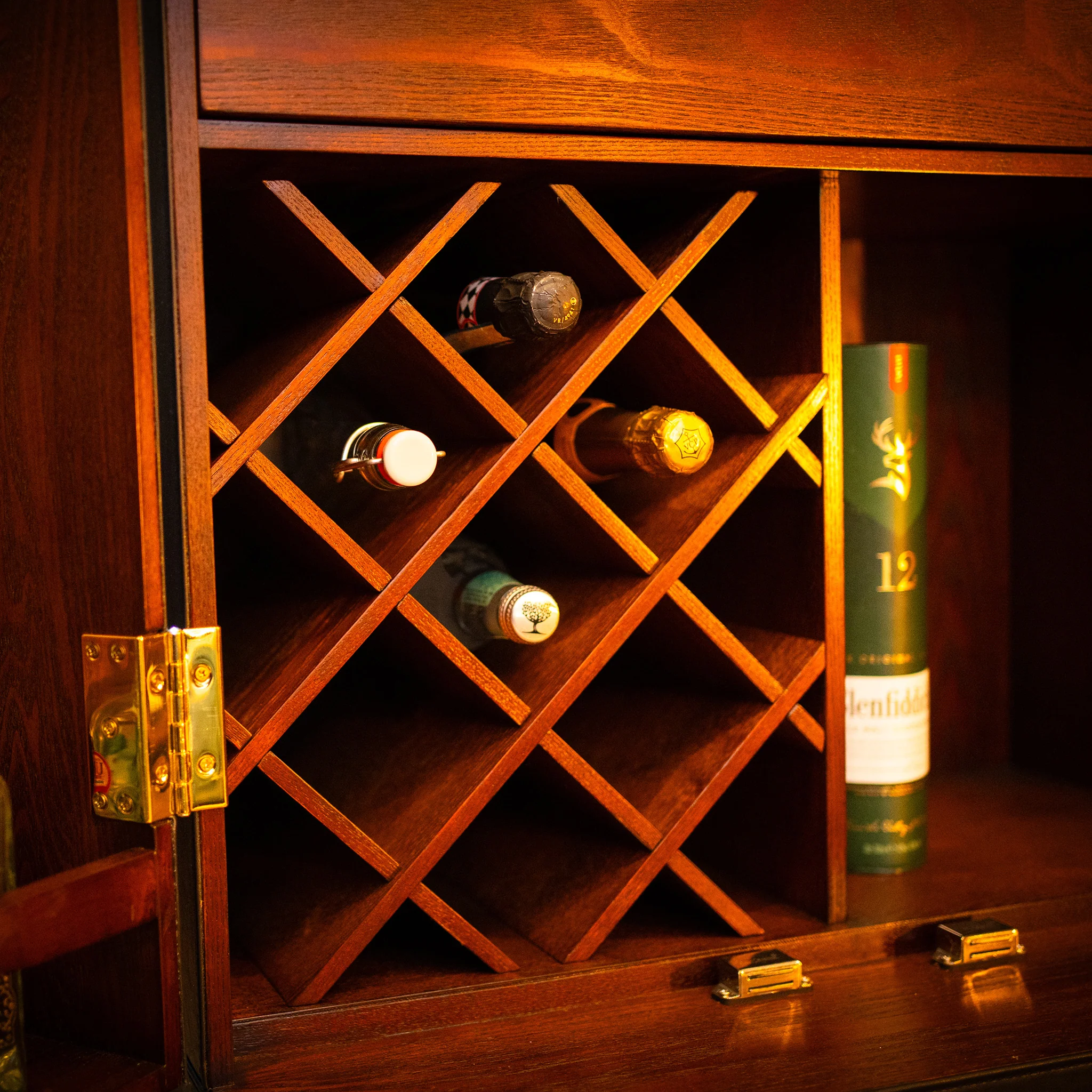 A large home bar cabinet is made for nights with friends. It's beautifully crafted from premium leather and wood. You'll find ample storage inside for bottles, drinks, cocktail accessories and glass storage.