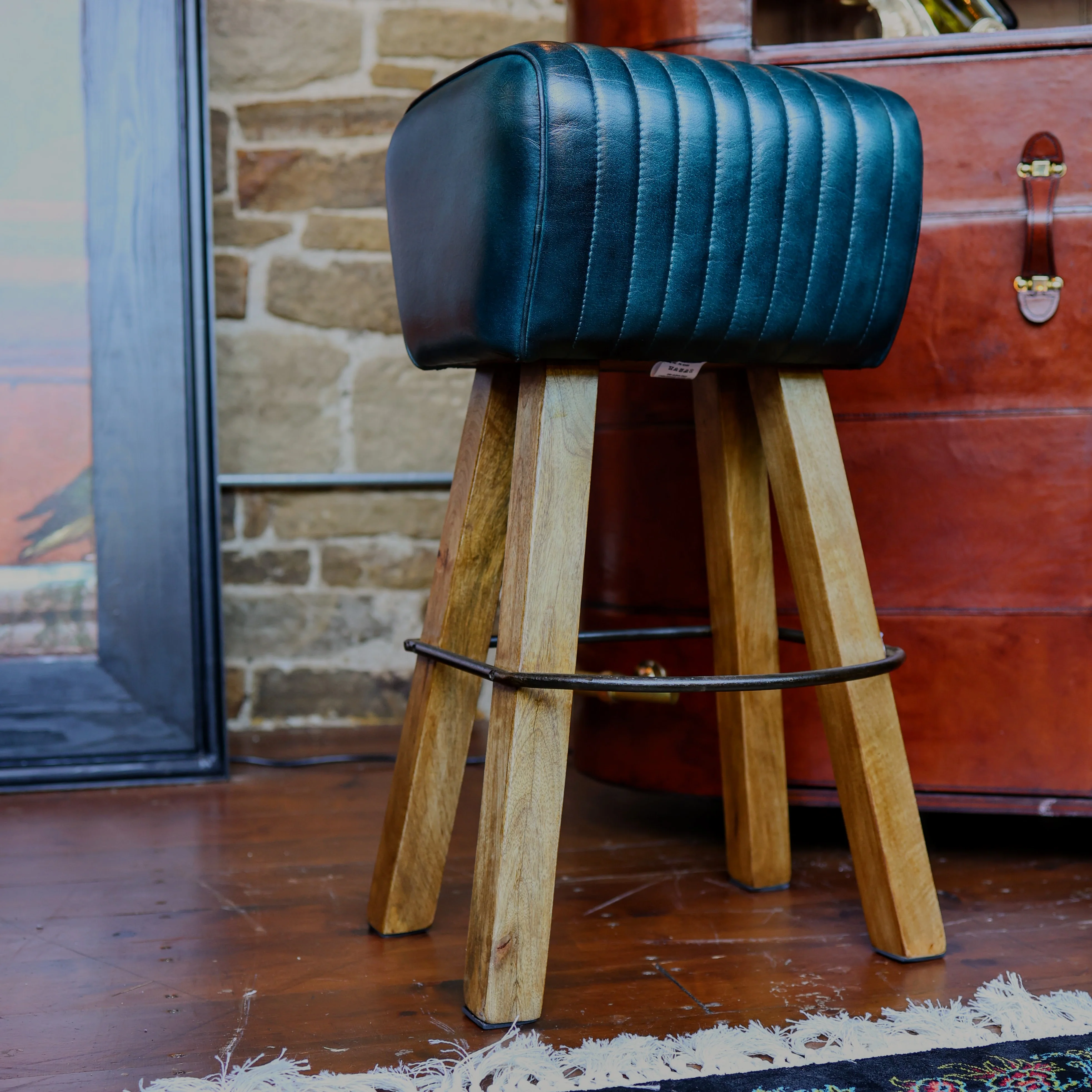Vintage style pommel horse in a blue buffalo leather. This Pommel bar stool is perfect for adding a vintage or industrial touch to your home. The buffalo leather is warm and hardwearing featuring the natural characteristics of the hide giving each stool it's own natural patina. Buffalo leather is easy to maintain and durable.